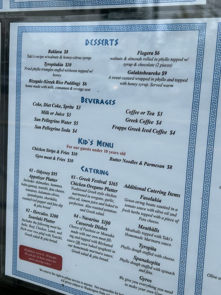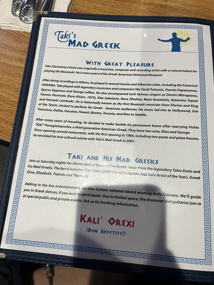 For the kids, there’s a delightful selection that includes Kids Chicken Strips and Gyro Meat with Fries. The atmosphere is casual, emphasizing good food and community, though service may vary. Many patrons rave about the standout Spanakopita and the addictive Greek potatoes. Live music events on Saturdays add to the lively dining experience, making Taki's Mad Greek a must-visit restaurant in Seattle for lovers of authentic Greek flavors.